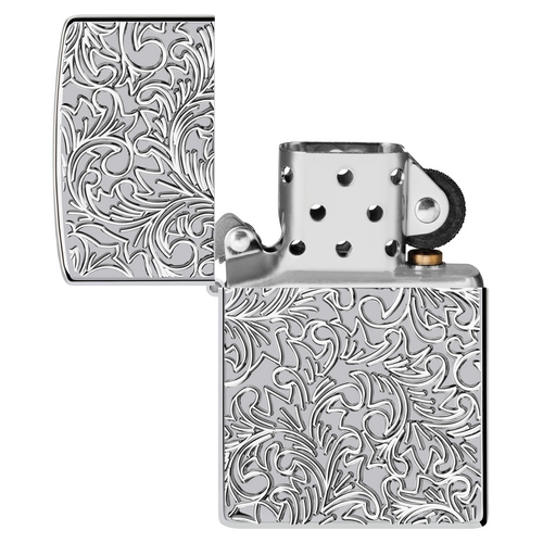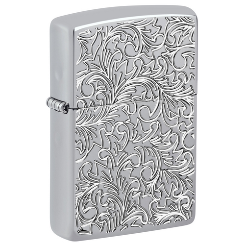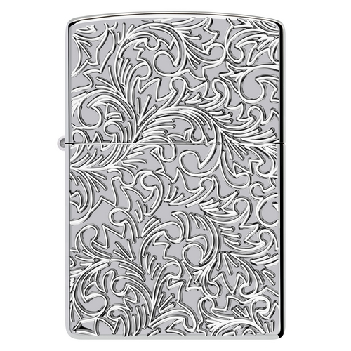 De Zippo armor case Pattern Design aansteker heeft een hoogglans chrome afwerking met op de voorzijde een gravure van een sierlijk patroon.