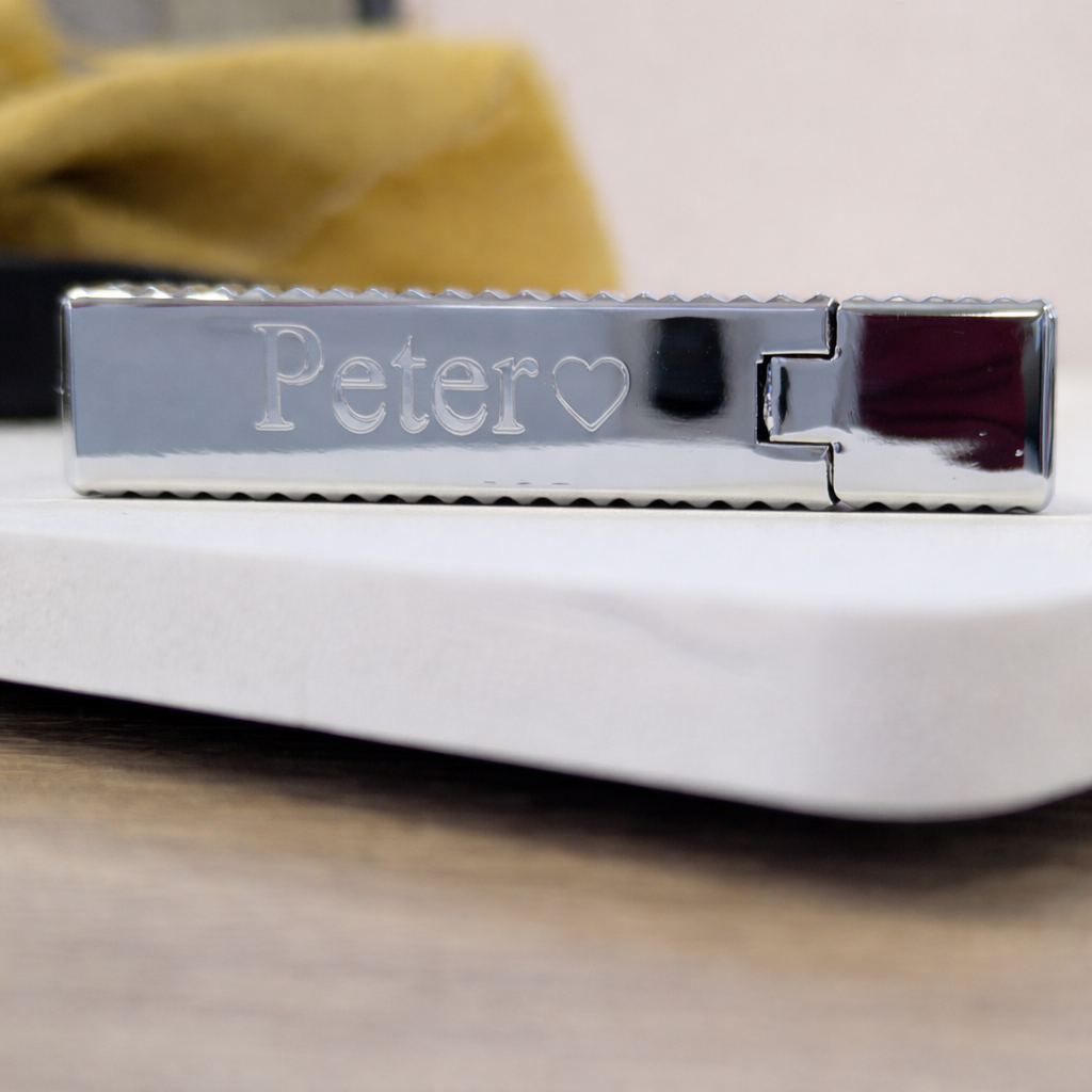 De gravure wordt stijlvol aan de zijkant van de aansteker geplaatst — subtiel en met een luxueuze uitstraling. Heb je graag een ander lettertype dan de getoonde opties? Vermeld dit gerust in het opmerkingenveld tijdens het bestellen.